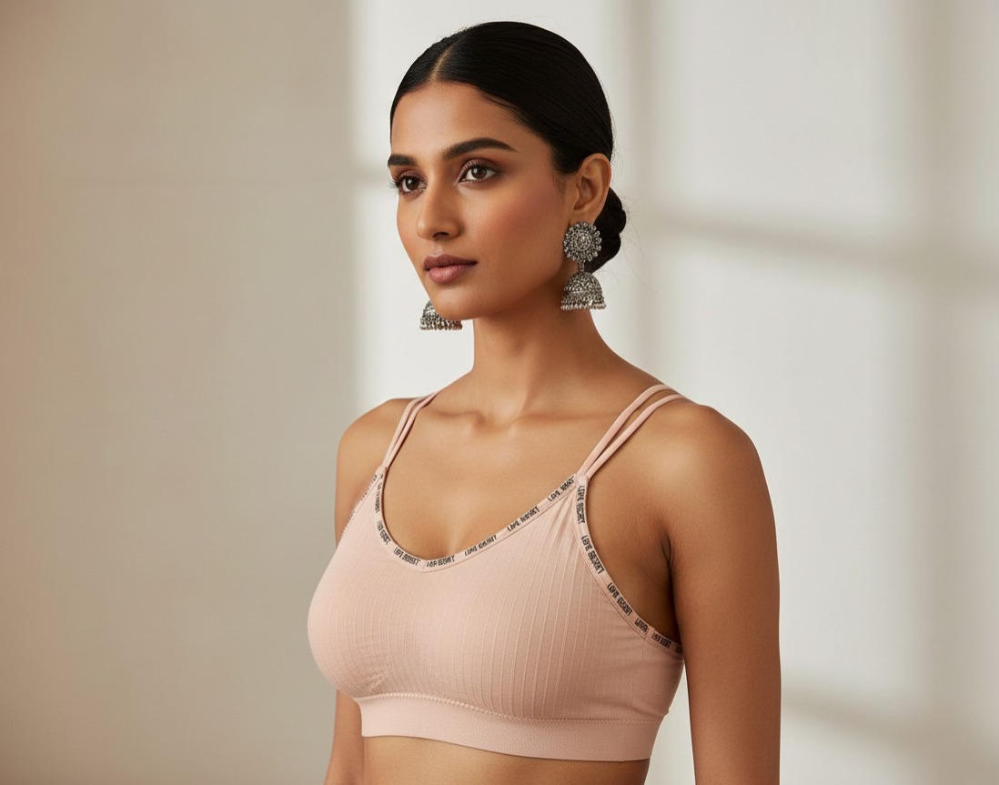 A seamless, ribbed bralette with a stylish V-neck, multi-strap design, and a comfortable elastic band, perfect for daily wear.