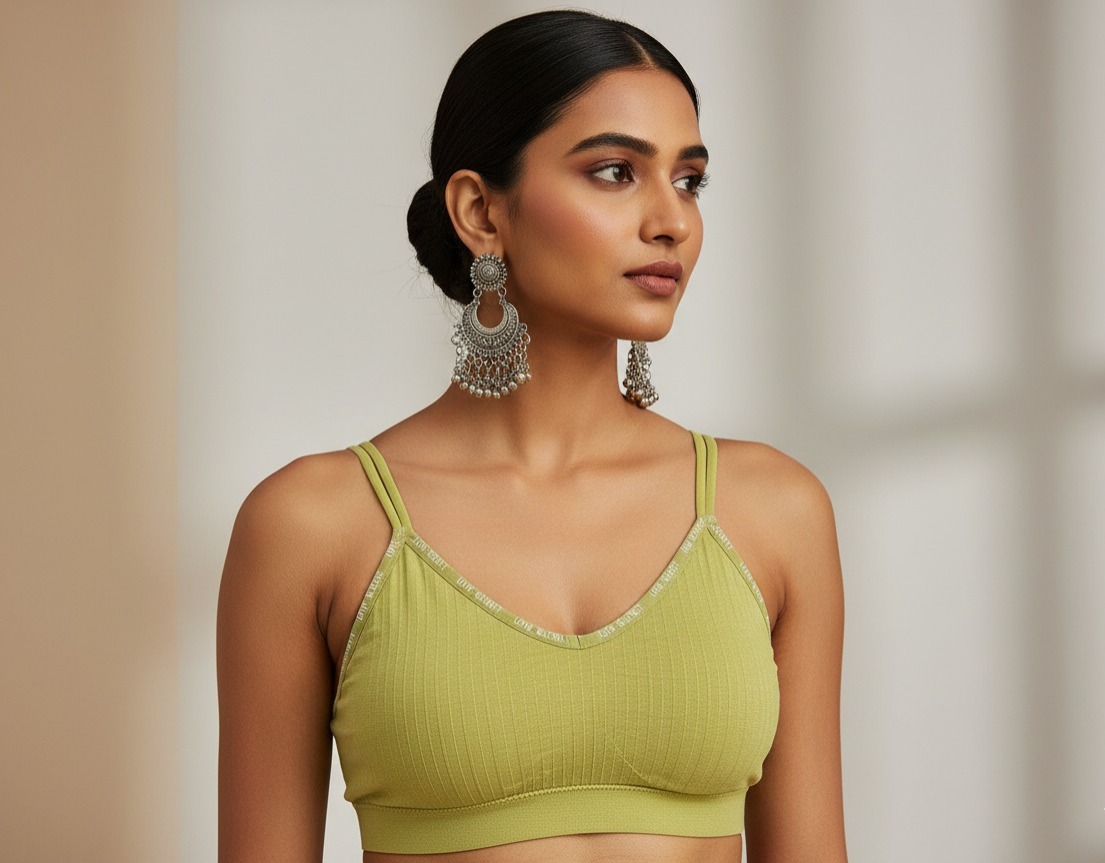 Fabric: The bra is made from a soft, ribbed, and likely stretchy material for comfort.