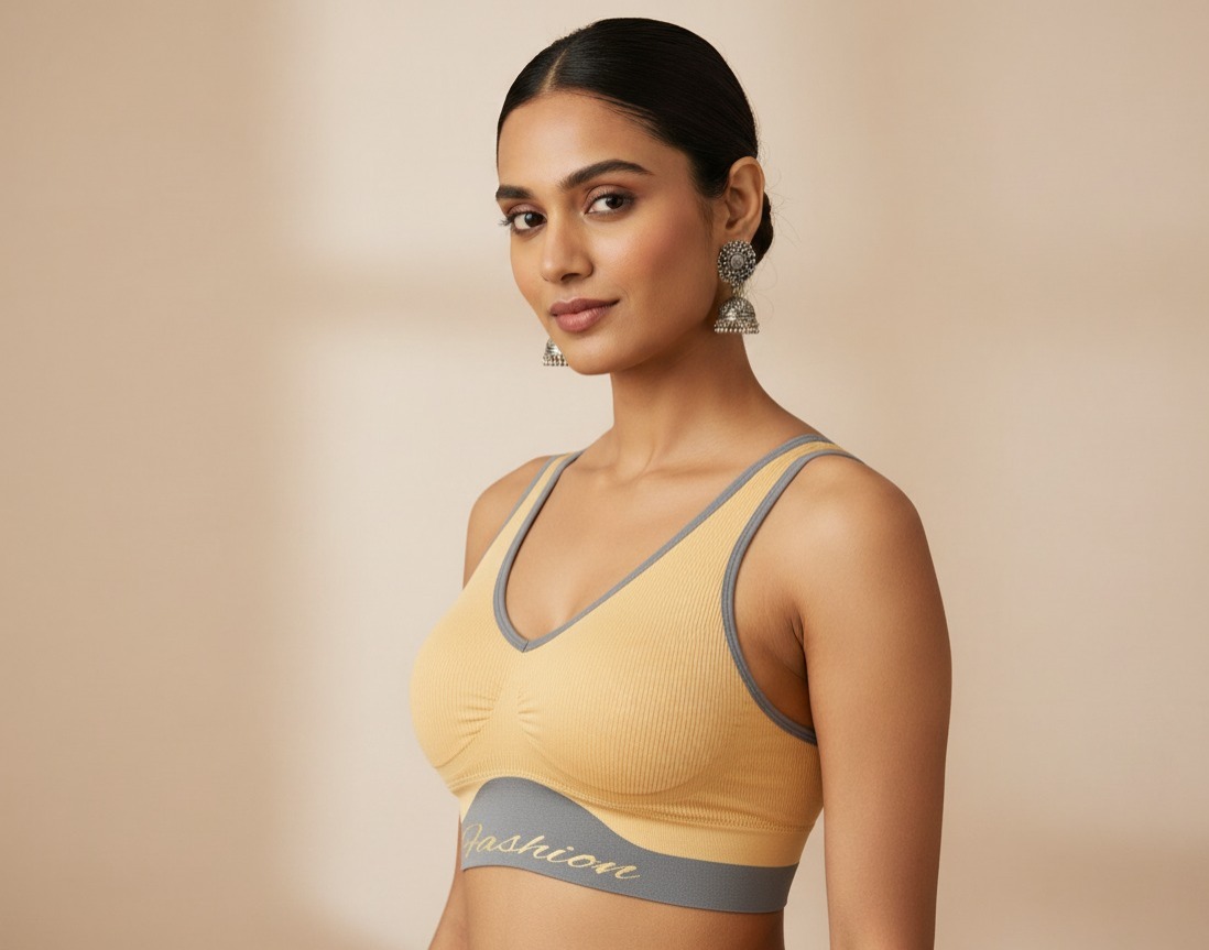 This is a comfortable and supportive sports bra designed for various physical activities. Its seamless, ribbed construction and soft, stretchy fabric ensure a smooth, comfortable fit with maximum flexibility. The bra features a stylish racerback design for enhanced mobility and support. It is trimmed with a contrasting color along the neckline and armholes, adding a pop of color to its muted tone. A prominent "SPORT" logo on the elastic underband reinforces its athletic purpose, making it a functional yet fashionable choice for workouts or everyday wear.