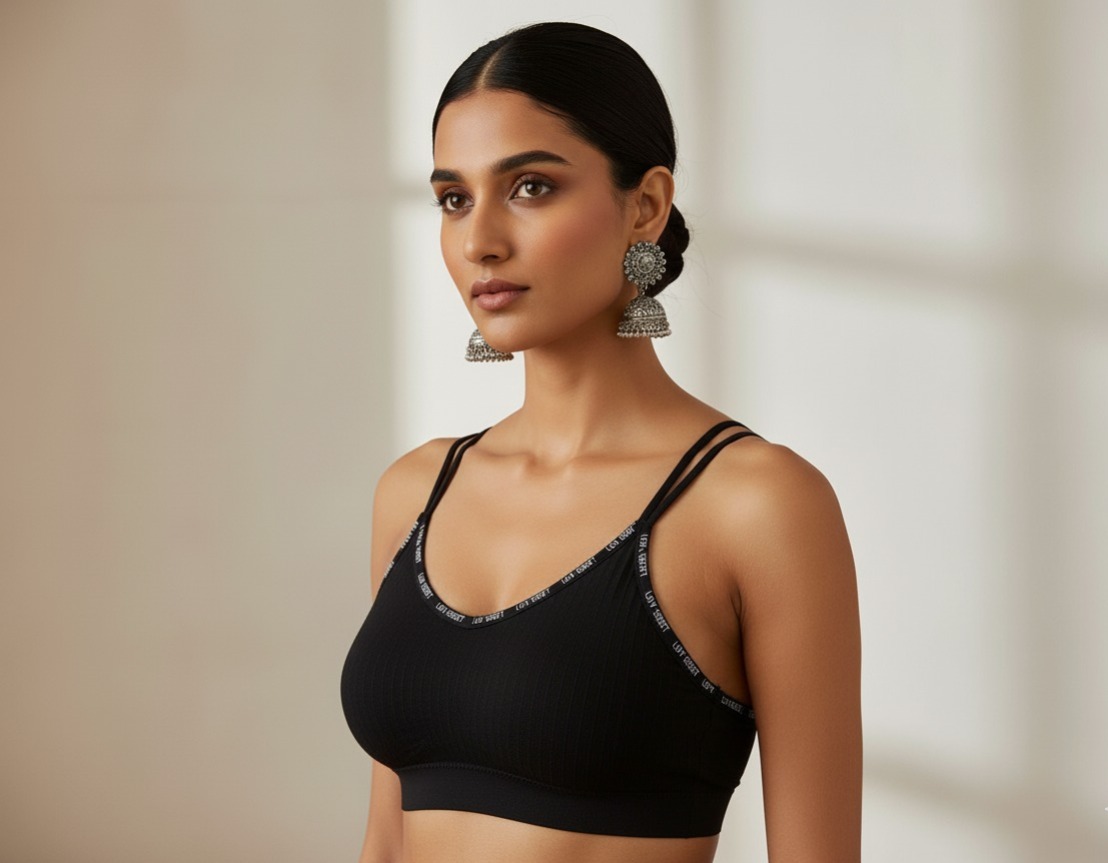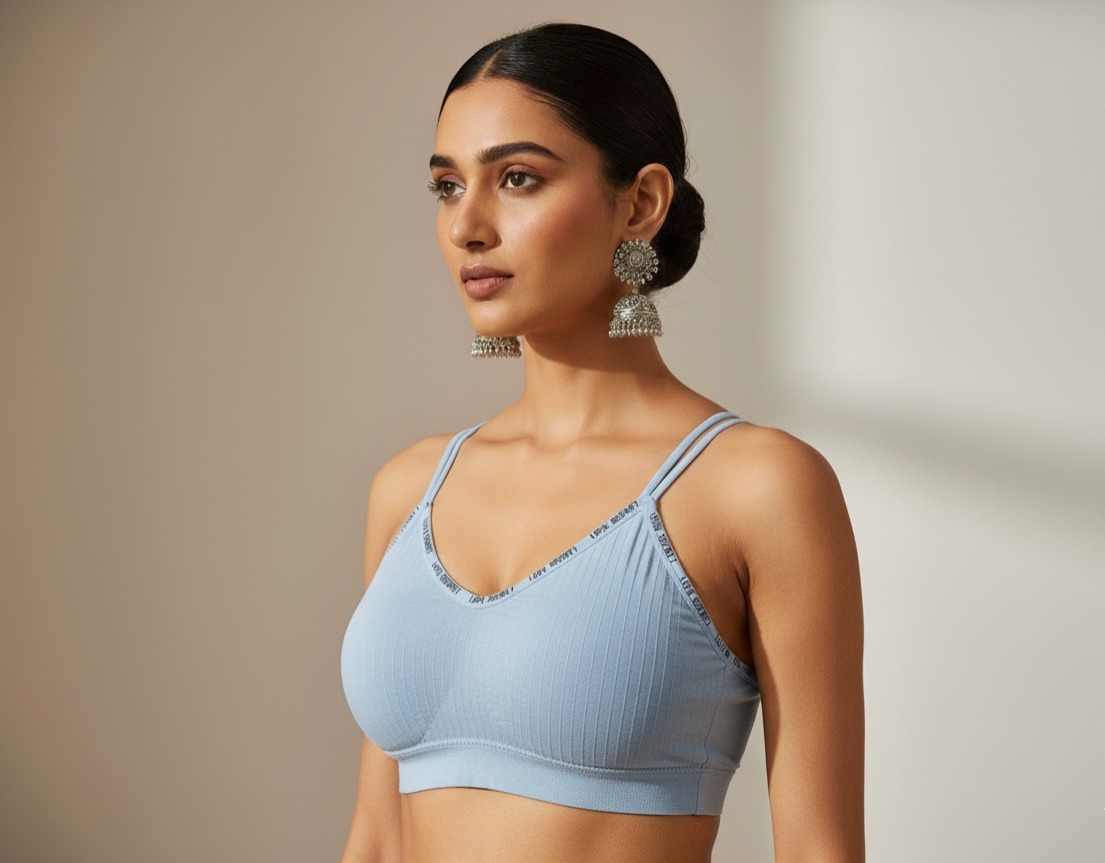 A seamless, ribbed bralette with a stylish V-neck, multi-strap design, and a comfortable elastic band, perfect for daily wear.